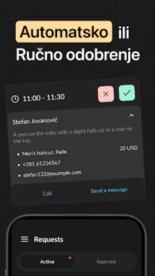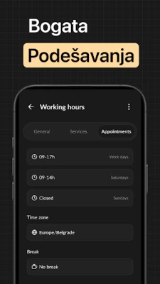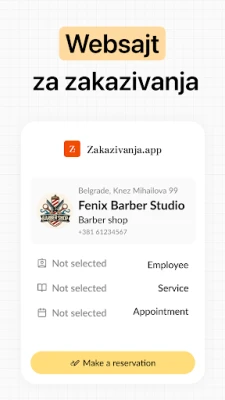 Kontrolirajte svoje poslovanje s lakoćom. Postavite radno vrijeme, dodajte usluge, cijene i zaposlenike. Pratite sve zakazane termine i primajte obavijesti u stvarnom vremenu o rezervacijama i otkazivanjima. Klijenti rezerviraju termine putem web stranice koju aplikacija automatski kreira za vas.